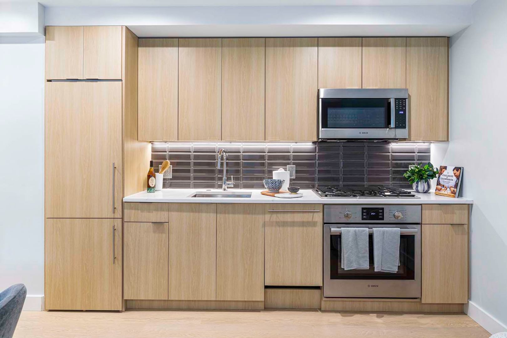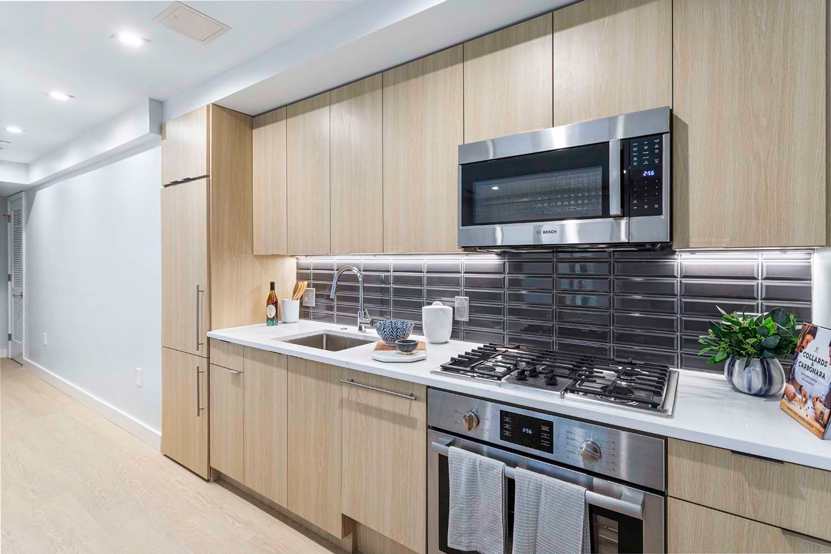 Vivre offers elevated finishes typically found in luxury condominiums. Interior features include floor-to-ceiling windows, wide-plank wood flooring, stainless steel appliances, quartz countertops, recessed lighting, full-size washer & dryer, fully controllable HVAC, custom window shades, fob-access electronic entry, full-size walk-in showers or soaking tubs, and private balconies in select homes. Kitchens feature custom woodgrain cabinetry, Bosch appliances with custom penalization, sleek exterior-venting hoods, under-cabinet lighting, and full-height designer backsplashes. Residents enjoy a concierge to assist with packages, a Wi-Fi-enabled penthouse-level interior lounge, and a rooftop deck with city views.