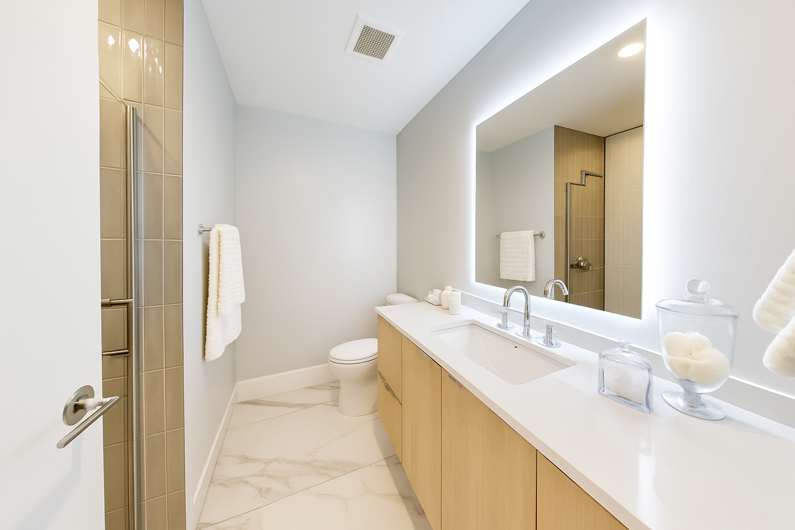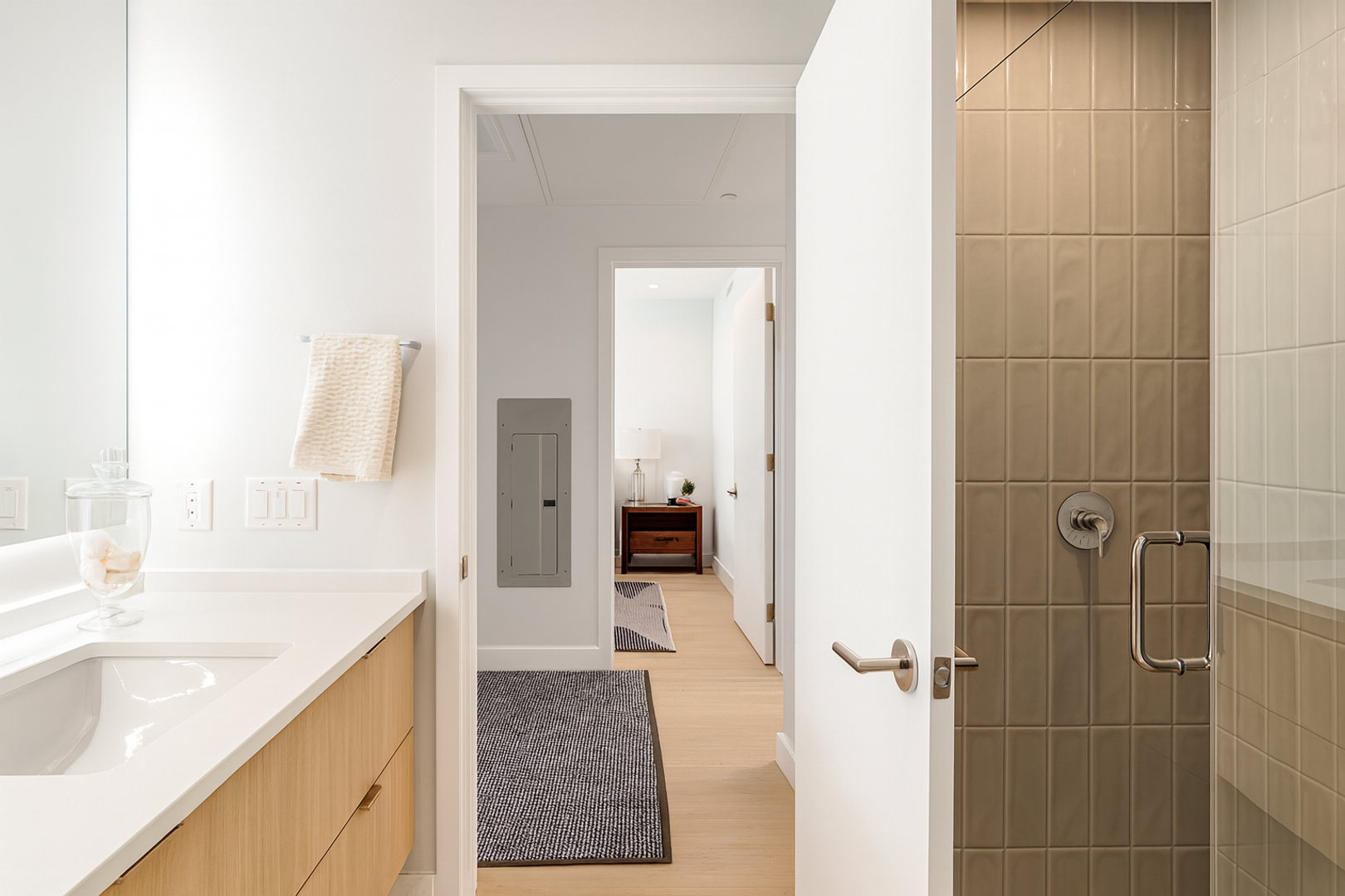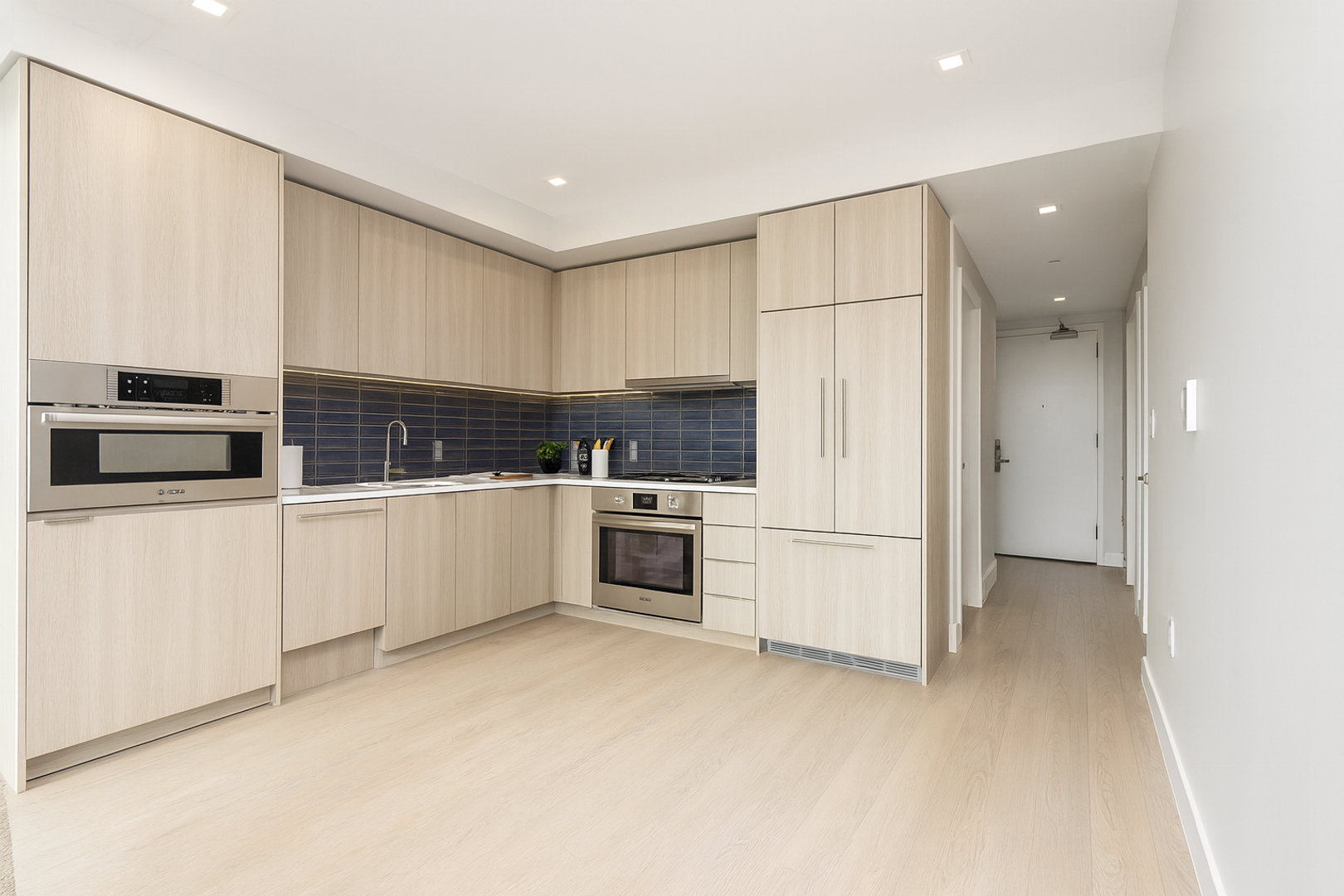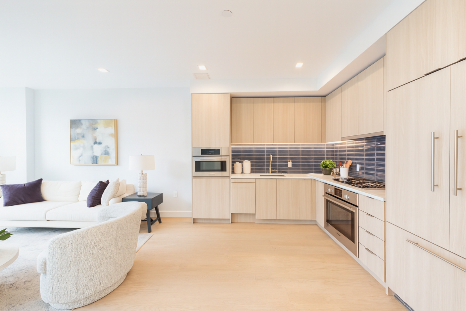 Vivre has designer finishes normally only found in luxury condominiums. Interiors epitomize modern luxury with floor-to-ceiling windows; wide-plank wood flooring; recessed lighting; full-size washer & dryer; custom window shades; private balconies in select homes. Kitchens feature custom woodgrain cabinetry; Bosch appliances with custom panelization; sleek hoods that vent out; under-cabinet lighting; full-height designer backsplashes. The spa-like baths boast 60" soaking tubs; marble-look bath tiles; comfort-height toilets.