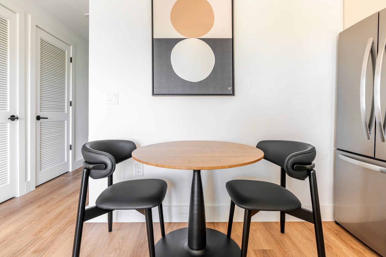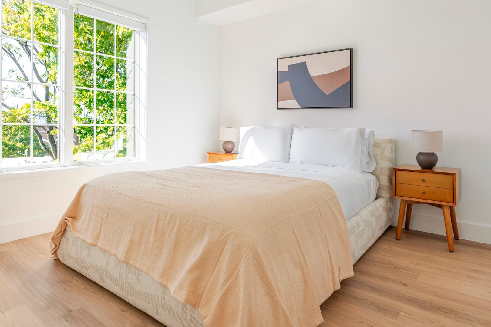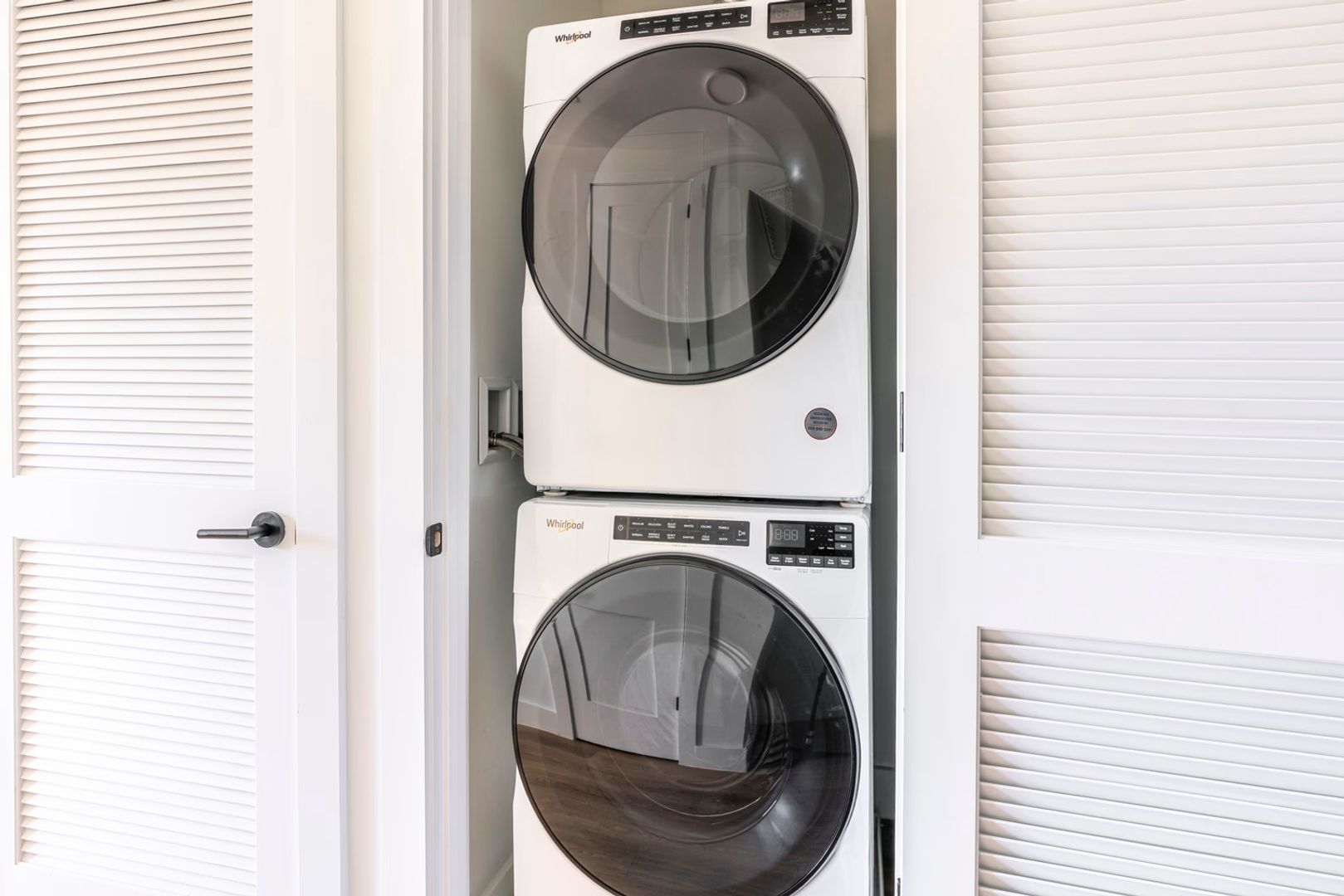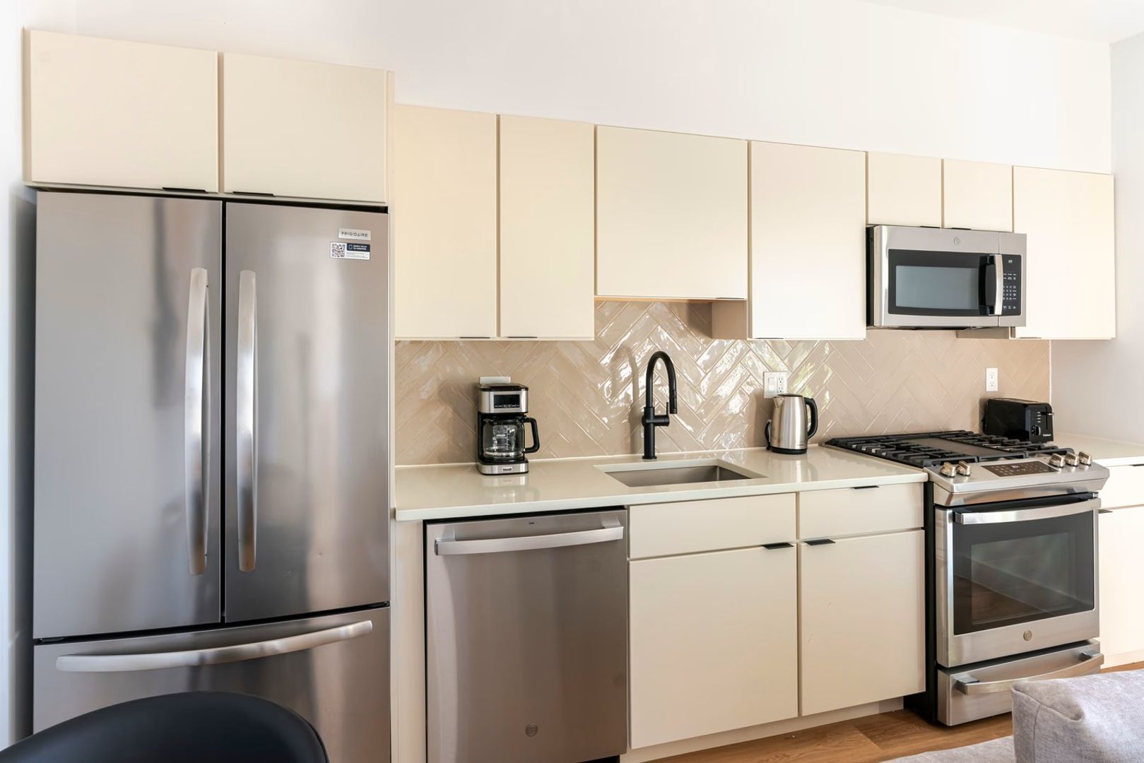 Enjoy premium features including hardwood-style flooring, stainless steel appliances, quartz countertops, secure fob entry, a full-size walk-in shower, abundant natural light, and an in-unit stackable washer and dryer.