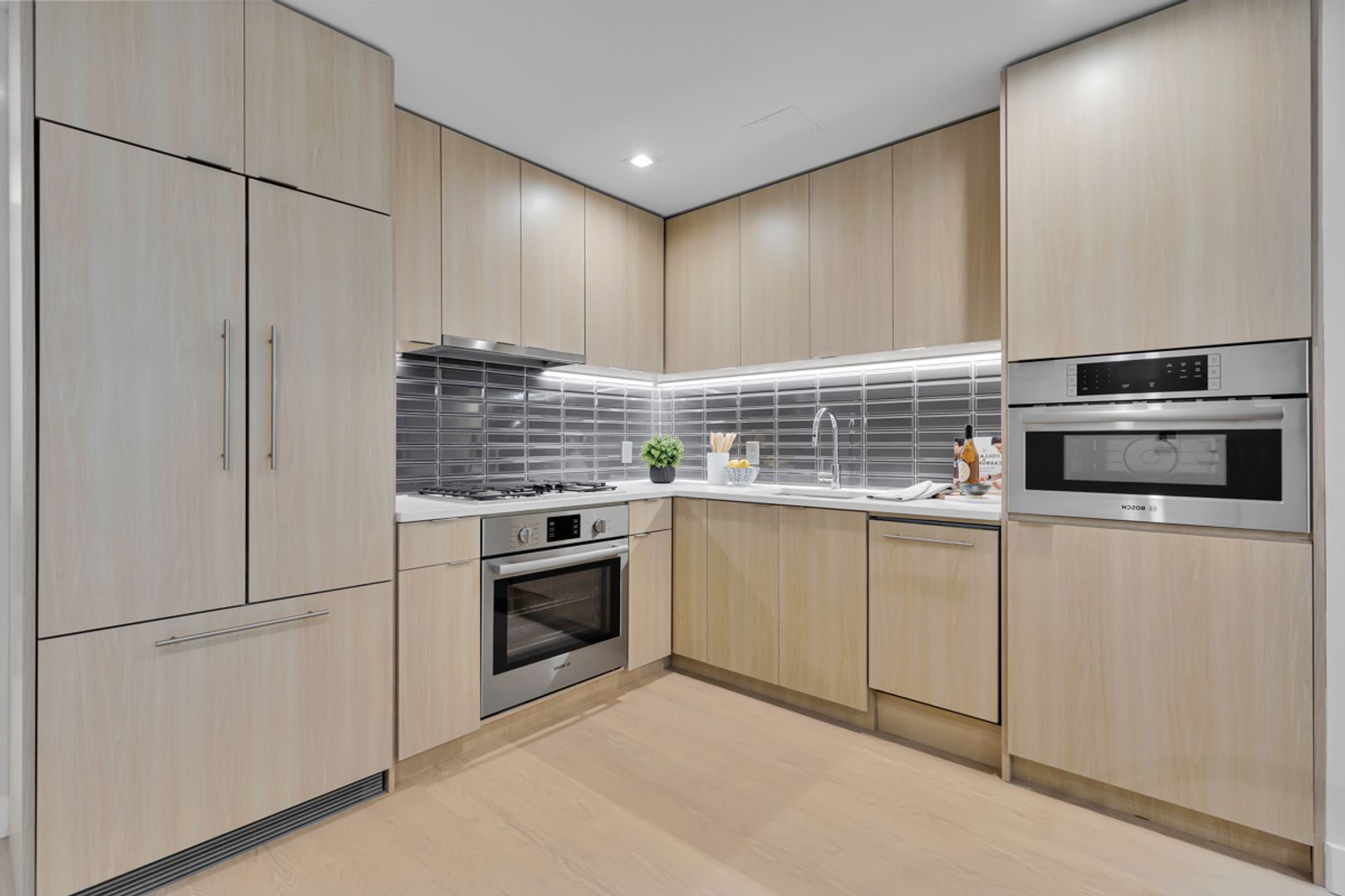 Vivre has designer finishes normally only found in luxury condominiums. Interiors epitomize modern luxury with floor-to-ceiling windows; wide-plank wood flooring; recessed lighting; full-size washer & dryer; custom window shades; private balconies in select homes. Kitchens feature custom woodgrain cabinetry; Bosch appliances with custom panelization; sleek hoods that vent out; under-cabinet lighting; full-height designer backsplashes. The spa-like baths boast 60" soaking tubs; marble-look bath tiles; comfort-height toilets.
