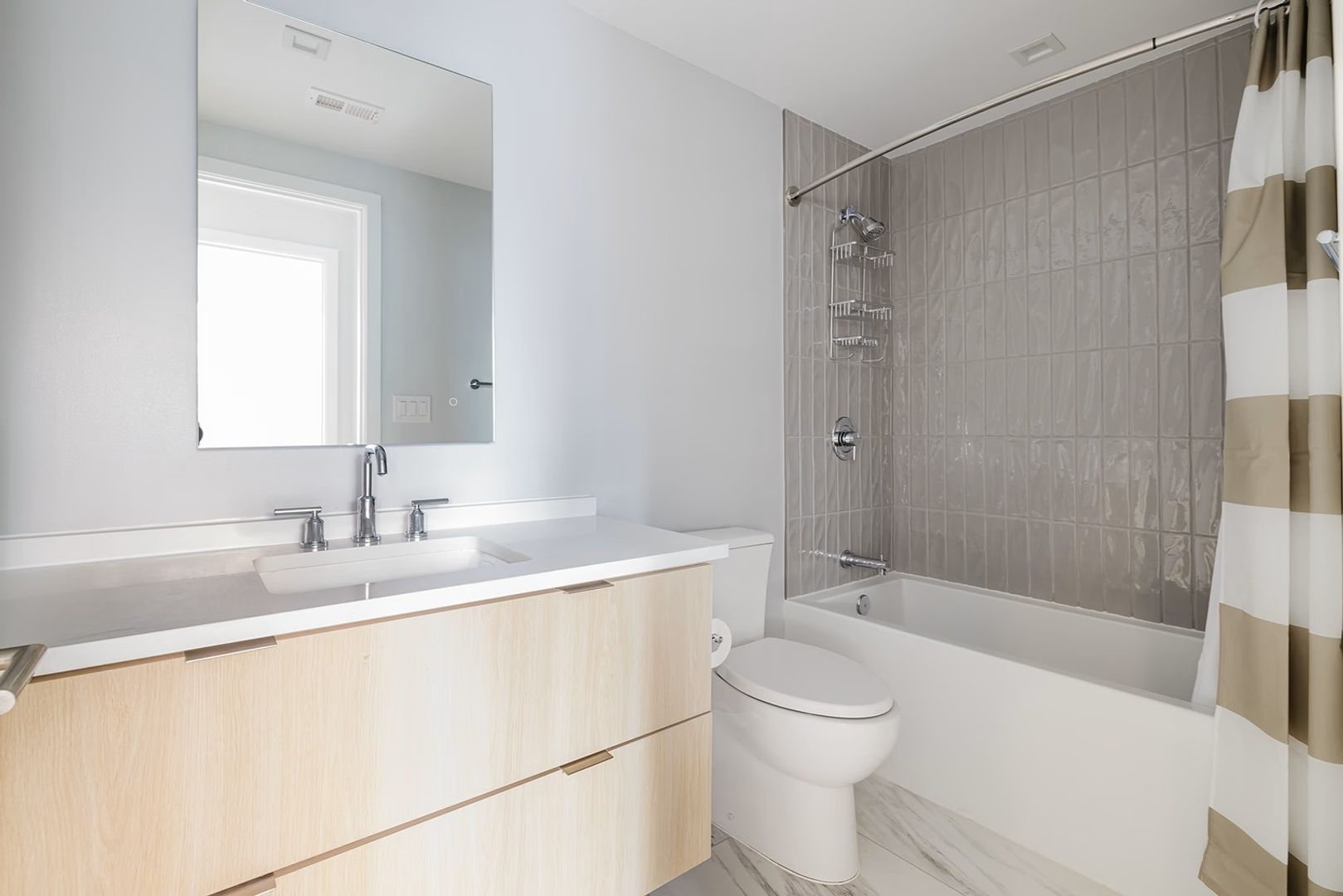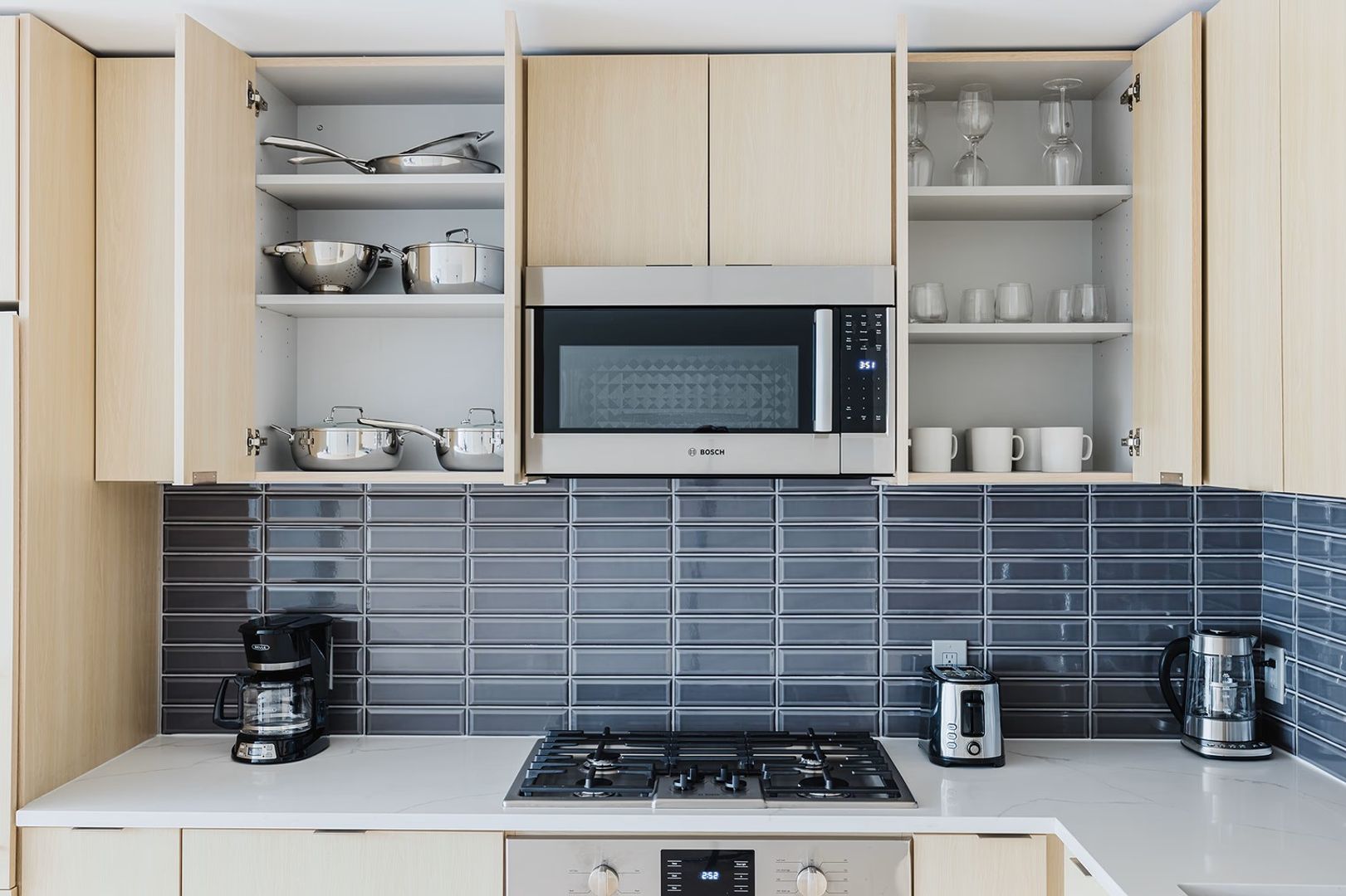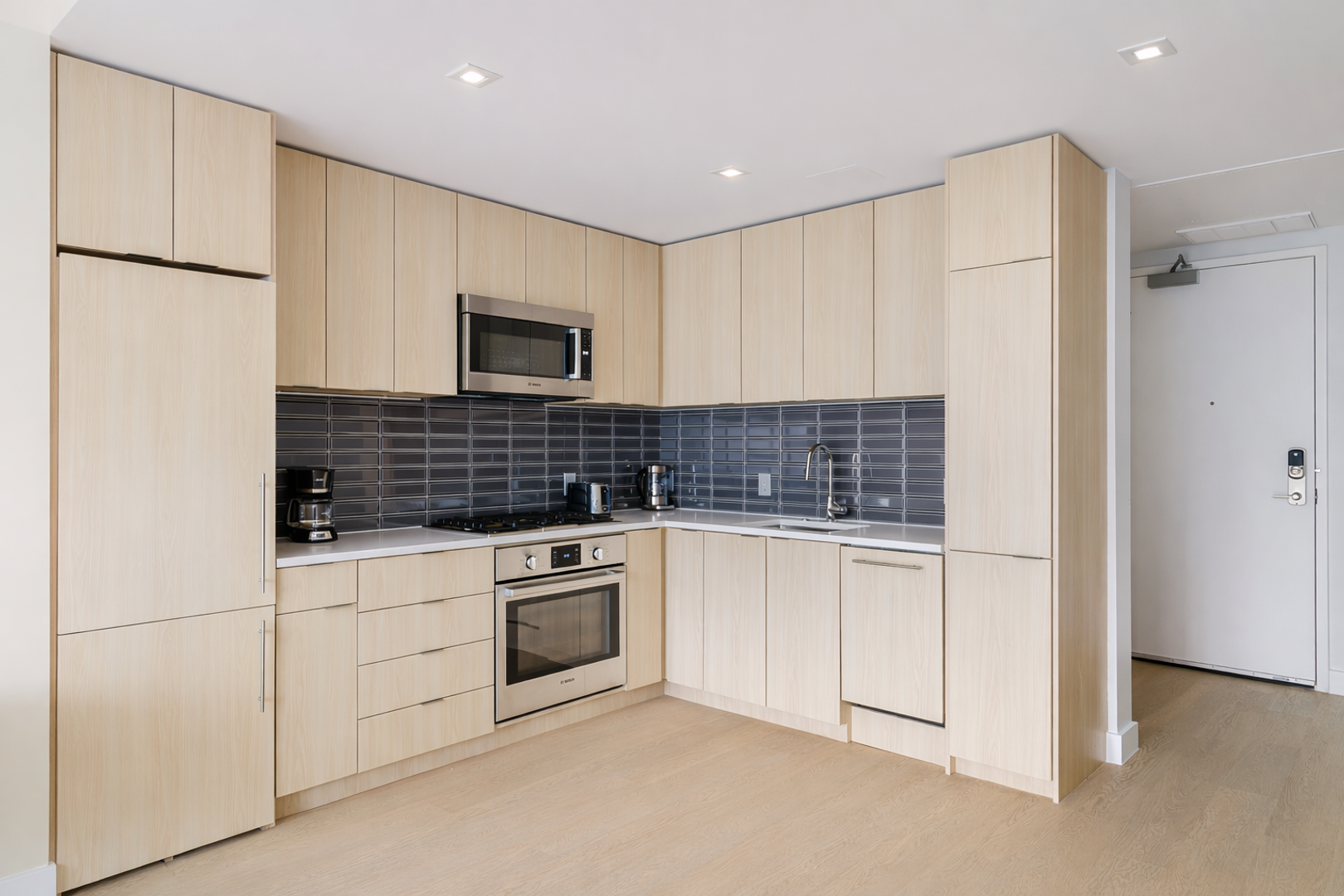 Vivre offers elevated finishes typically found in luxury condominiums. Interior features include floor-to-ceiling windows, wide-plank wood flooring, stainless steel appliances, quartz countertops, recessed lighting, full-size washer & dryer, fully controllable HVAC, custom window shades, fob-access electronic entry, full-size walk-in showers or soaking tubs, and private balconies in select homes. Kitchens feature custom woodgrain cabinetry, Bosch appliances with custom penalization, sleek exterior-venting hoods, under-cabinet lighting, and full-height designer backsplashes. Residents enjoy a concierge to assist with packages, a Wi-Fi-enabled penthouse-level interior lounge, and a rooftop deck with city views.